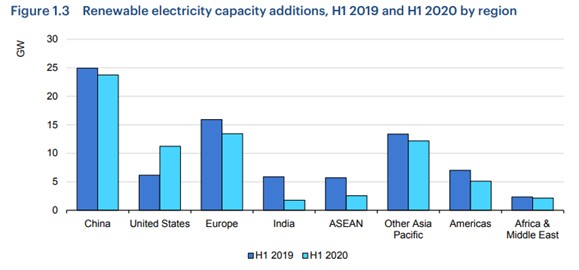Nel grafico la nuova capacità rinnovabile installata nel primo semestre del 2019 e 2020 per regione del mondo.