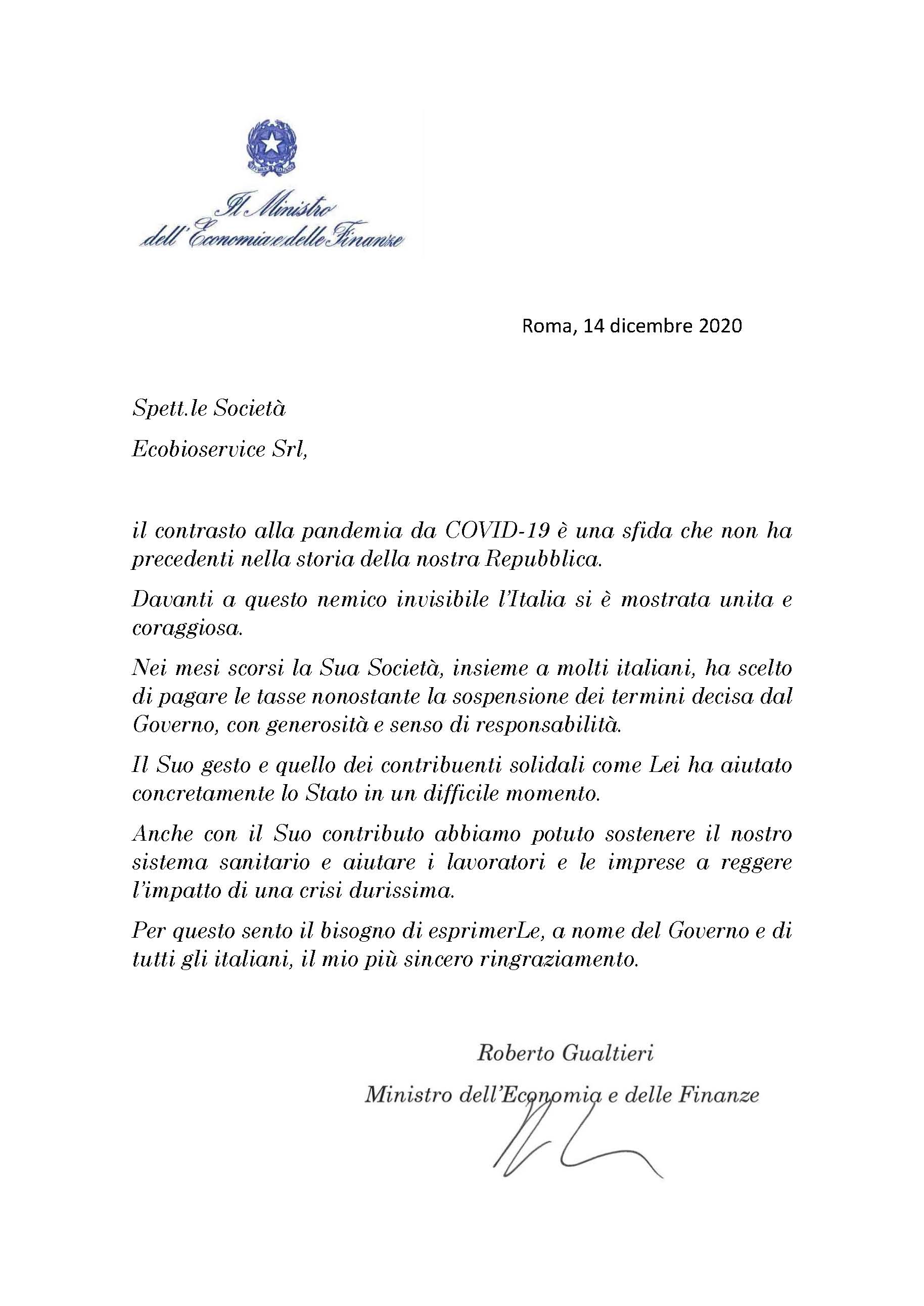 Il Ministero dell'Economia e delle Finanze ringrazia EcoBioService