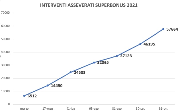 Gli interventi asseverati di Superbonus 110% a fine ottobre erano 57664. Crescono al passo del 24,8% rispetto al mese precedente e allo stesso ritmo (a settembre era 24,5%). La curva delle asseverazioni, in alto, mostra di conseguenza una buona pendenza. Sono oltre 8300 i condomìni in cui sono in corso o sono terminati i lavori del super incentivo. Gli edifici unifamiliari (le villette e simili) sono quasi 30 mila mentre le cosiddette unità immobiliari funzionalmente indipendenti sono quasi 20 mila.