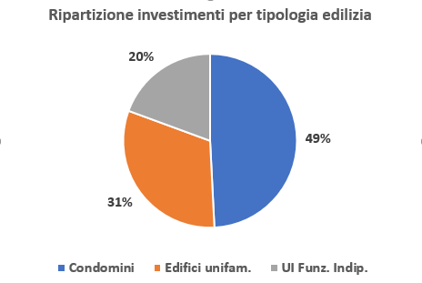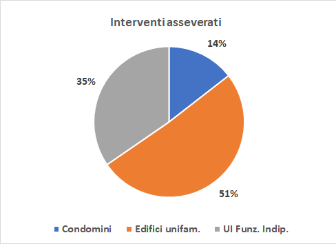 Di fatto, come mostra la torta qui sopra, gli edifici unifamiliari rappresentano grossomodo metà del numero degli interventi asseverati. Seguono (35%) le unità immobiliari funzionalmente indipendenti e i condomini che sono il 14% degli interventi.
