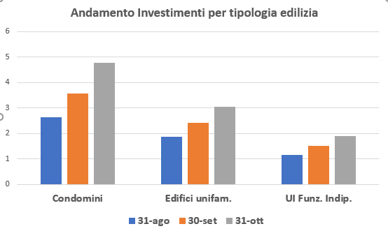 Dal 31 agosto al 31 ottobre gli investimenti ammessi a detrazione hanno compiuto un poderoso balzo in avanti salendo del 71,3% passando da 5,6 miliardi a 9,7. Quasi 10 miliardi: niente male in soli due mesi. Metà degli investimenti (49,2%) sono stati destinati comprensibilmente a interventi su condomini. Il 31,4% degli investimenti ad edifici unifamiliari e il restante 19,4% a unità immobiliari funzionalmente indipendenti.