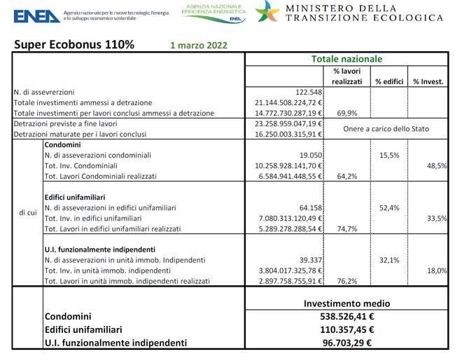 L'Enea ha diffuso i dati aggiornati sull’utilizzo del Super Ecobonus 110%: al 1° marzo 2022, il totale degli investimenti ammessi a detrazione hanno superato i 21 miliardi di euro (erano 18,3 a fine gennaio scorso).