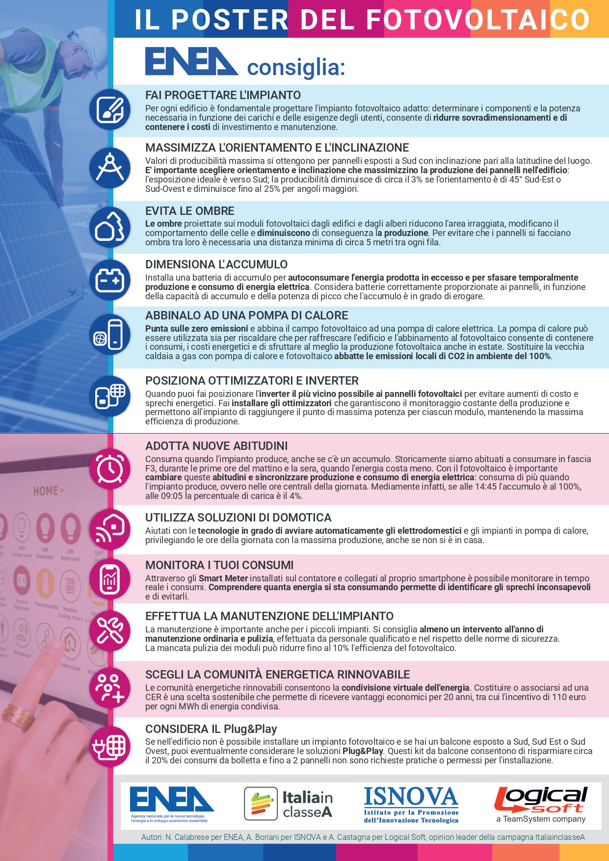 Sono presenti anche consigli su: batterie, abitudini di consumo energetico, manutenzione impianti, soluzioni Plug&Play (detto anche fotovoltaico da balcone) e uso di domotica e Smart Meter.